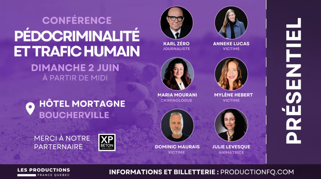 LES PRODUCTIONS FRANCE-QUÉBEC présente une conférence d’envergure sur la pédocriminalité et le trafic humain, le dimanche 2 juin 2024 à l’Hôtel Mortagne de Boucherville.