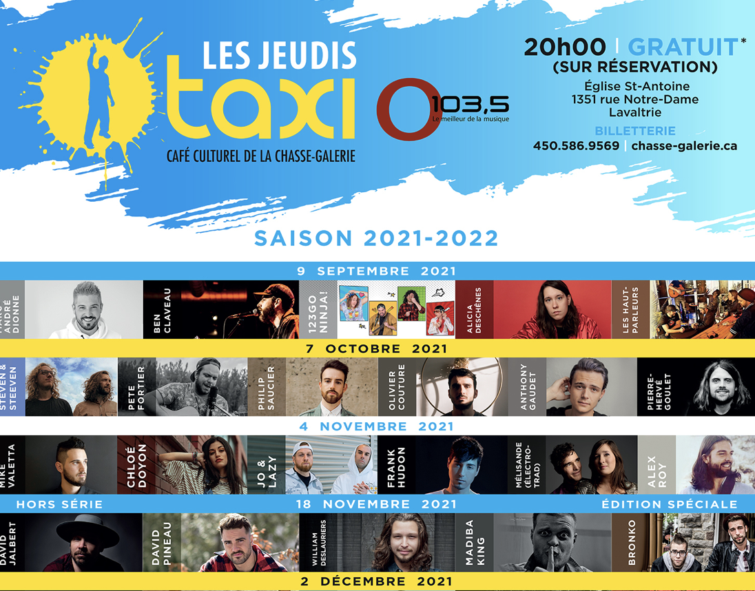 L’aventure des Jeudis Taxi, débuté à l’automne 2014 au Café culturel de la Chasse-galerie, ne devait durer qu’une seule saison. Huit ans plus tard, la série est bien vivante et présente aujourd’hui la programmation de la saison 2021-2022. Avec en tête d’affiche pas moins de 59 artistes de tous styles musicaux confondus allant du pop au folk en passant par le country, le hip-hop, le rock et l’électro, la prochaine année promet d’être riche en couleurs.