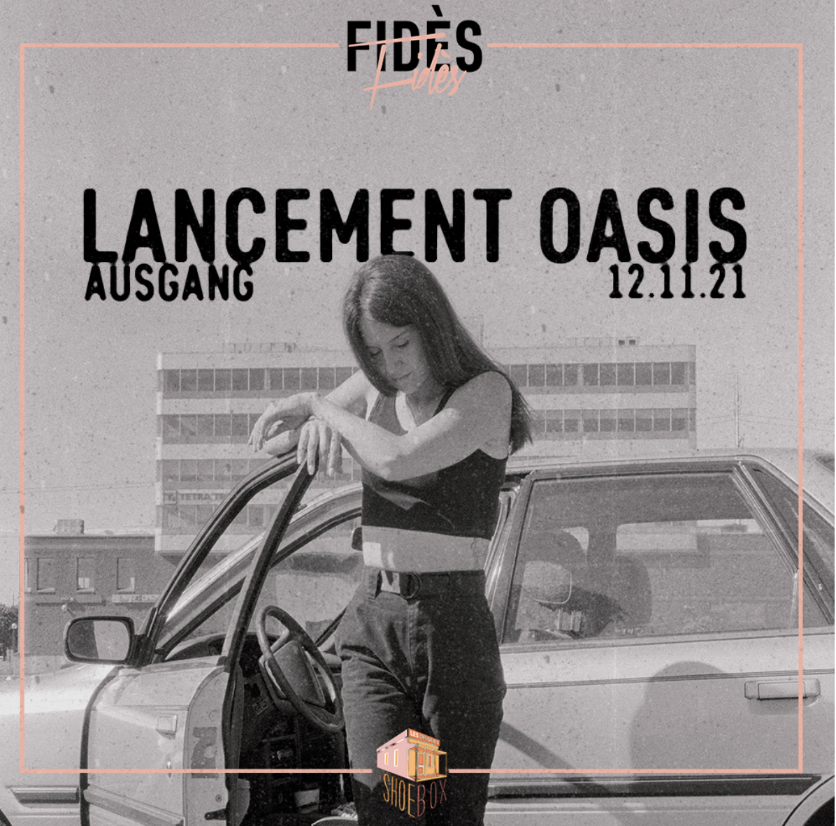 Après le dévoilement du premier single Cendrillon, La Shoebox est fière de présenter le lancement du premier EP de FIDÈS, OASIS, le 12 novembre prochain au Ausgang Plaza. Au programme : un DJ set du beatmaker et multi-instrumentaliste aux influences hip-hop, R&B et électronique KOLA (Nicolas Lajeunesse), une performance des sept titres d’OASIS, par FIDÈS et ses deux musiciens, et une dernière partie par le DJ unique en son genre Truwayz, qui transportera le public dans son univers jusqu’à la fin de la soirée.
